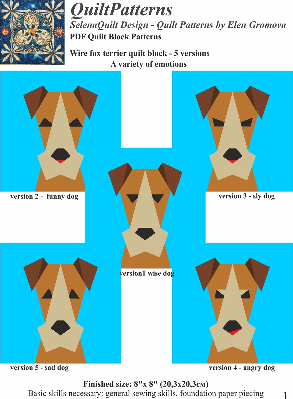 1 PDF files: 25 pages and includes: - 8" Dog quilt block patter (5 versions); - models of segments of the blocks with a seam (all version). Seam width 1/4"; - templates with a seam (version 1). Seam width 1/4"; - Instruction for Assembly; - Instruction and table for decreasing/increasing block; - examples of block decoration;